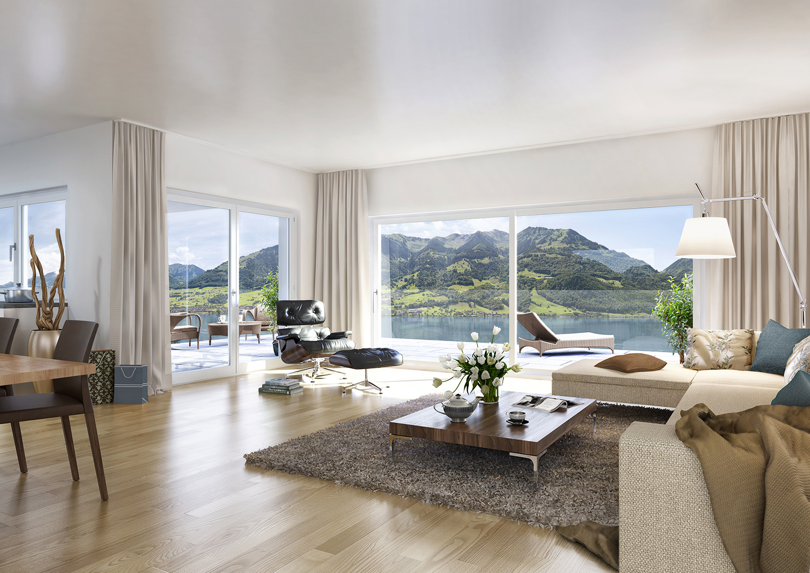 Alle Wohnungen haben eine unverbaubare Berg- und Seesicht. Hier das Wohnzimmer von Sky Eden B.